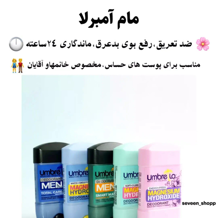 از مام آمبرلا نگم که این روزا خیلی ترندشده و طرفدارای زیادی داره ماندگاری ۲۴ساعته خیلی روان روپوست میشه زد بوی بد عرق رو تا ۲۴ساعت میگیره و از بوی بد راحت میشی بدو بده تا تموم نشده ازطریق t @seveen_shopp